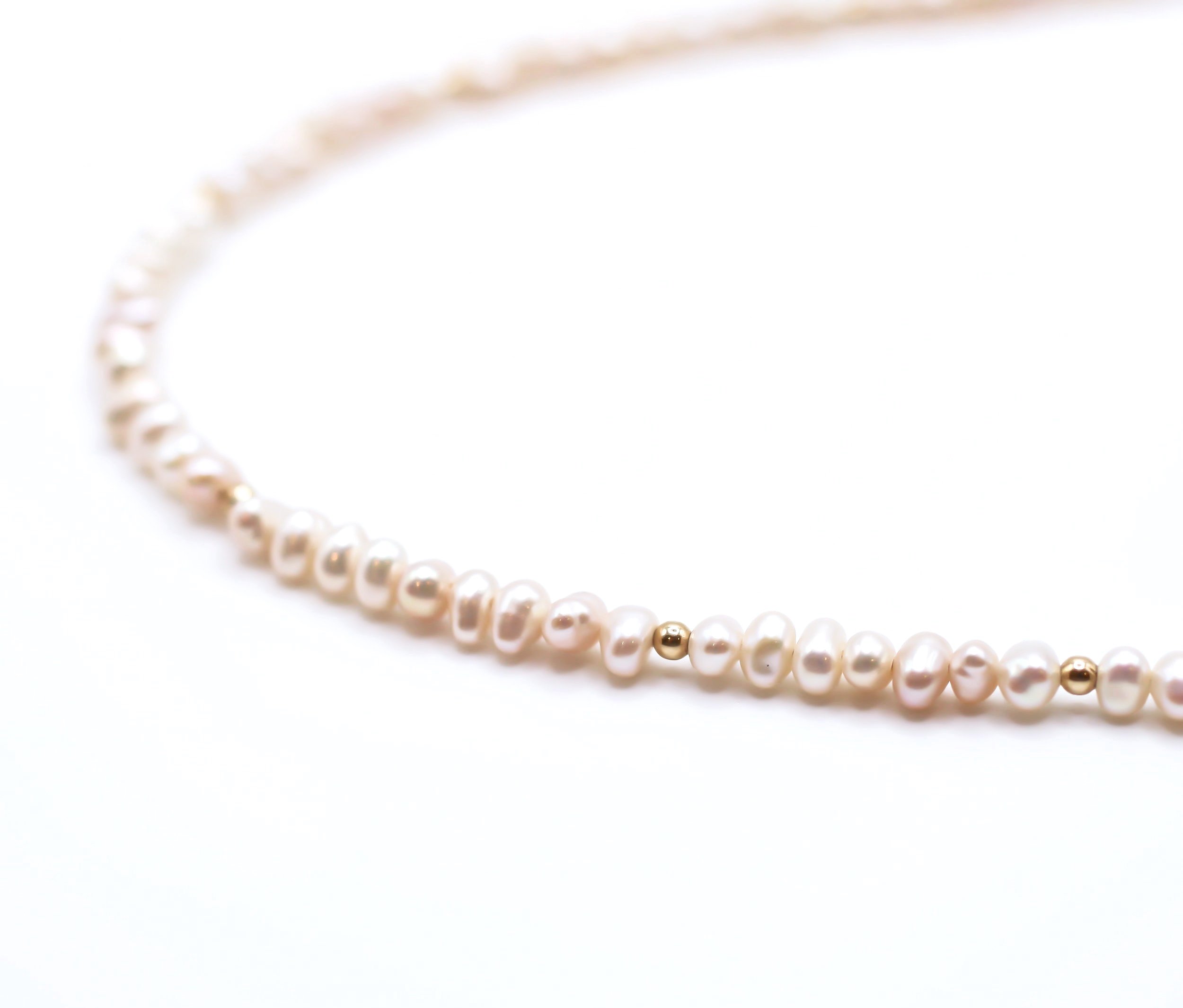 A charming hand made necklace using high quality Grade A natural off white freshwater potato pearl beads (3 mm). This design is available with either sterling silver or 14ct gold filled beads and finished with a matching toggle clasp.